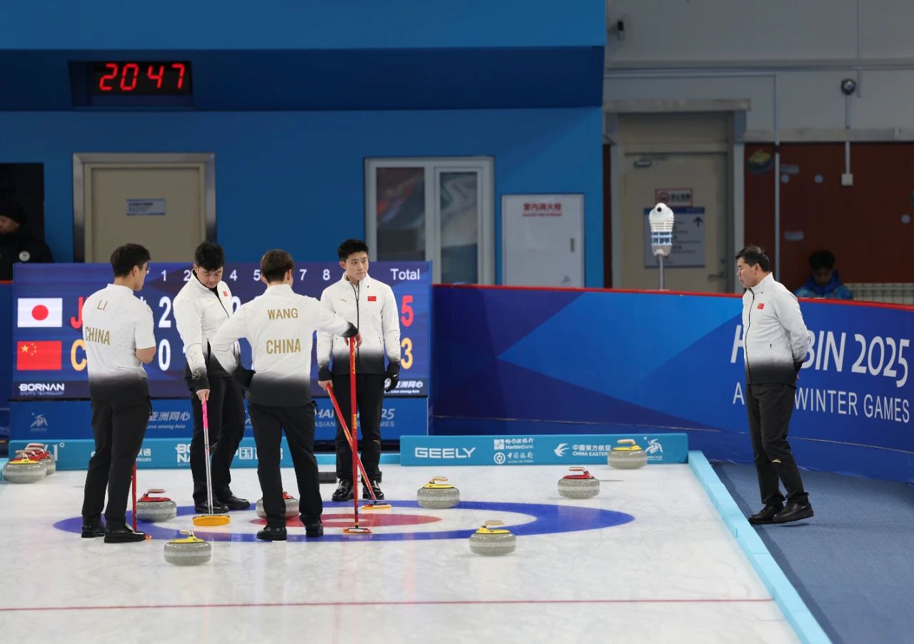 哈爾濱亞冬會男子冰壺循環(huán)賽在2月12日迎來了中國隊對陣日本隊的比賽,這場比賽前,中國隊4戰(zhàn)全勝已經(jīng)鎖定B組晉級資格。開賽后由中國隊執(zhí)黃色壺先進行投擲,經(jīng)過系列賽的磨合,隊員們之間顯得更加默契,大家從賽前熱身階段就保持著頻繁的交流,教練員也在熱身階段走上冰場和隊員們一起交流部署。